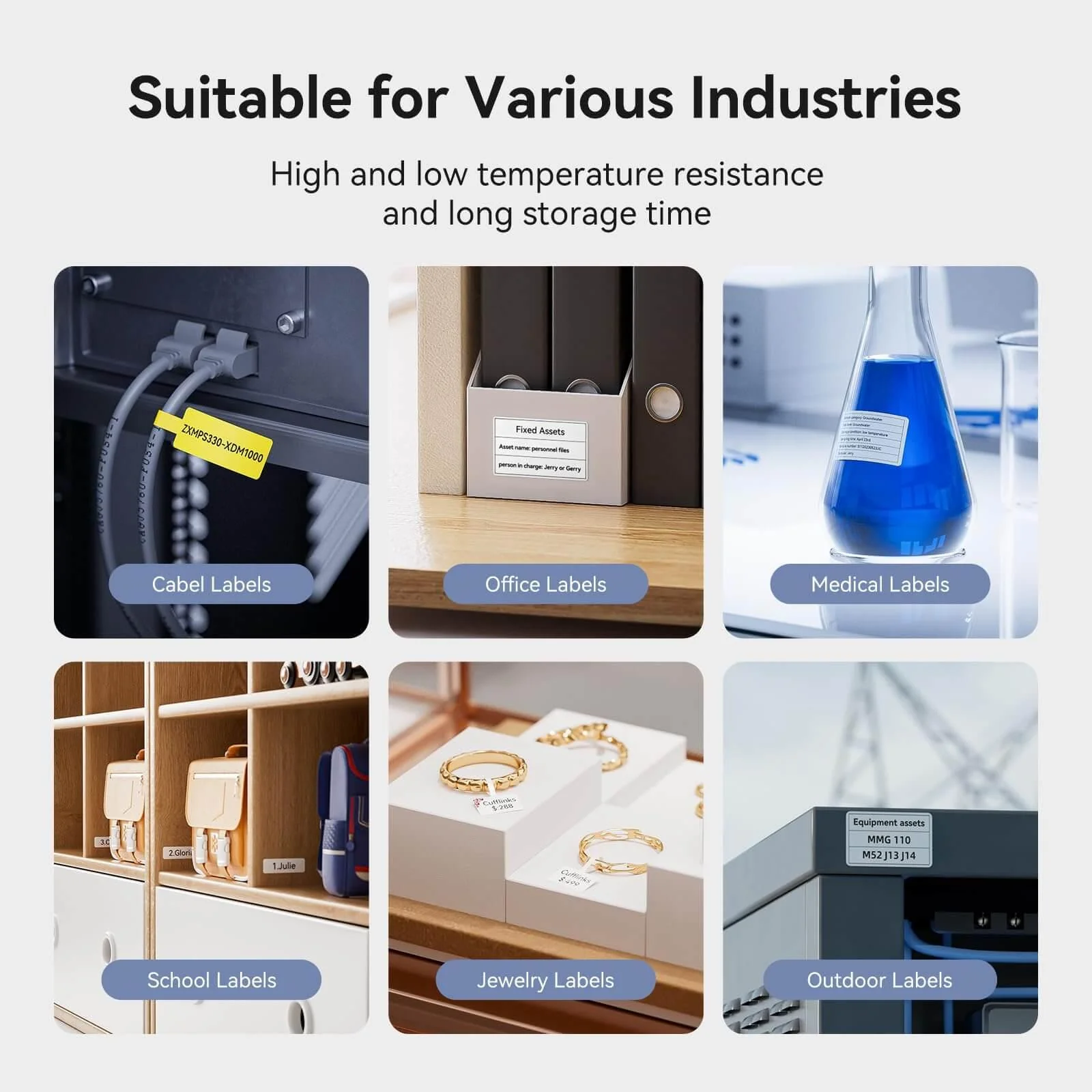 - 8-10 years long-lasting labels with friction resistance, low temperature resistance, light resistance, high temperature and sun resistance.